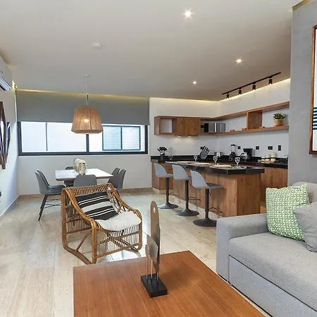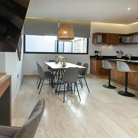 Apartamento Moderno Depa 2BR con Alberca en Rooftop 5ta Avenida tem terraço e cozinha totalmente equipada, e confortos como controle de temperatura.